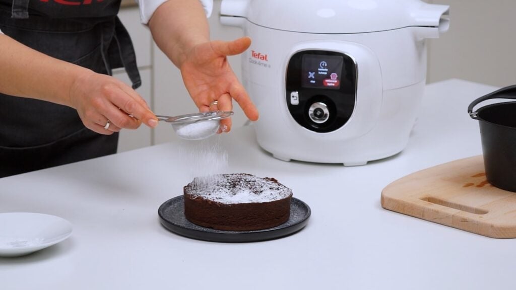 3. Na Cook4Me odabrati u popisu recepata među desertima Capres etortu i slijediti upute. Uglavnom, u lonac se dodaje 300 ml vode i nastavak za kuhanje na pari, a u njega kalup sa biskvitnom masom. Poklapa se i kuha pod pritiskom dok ne bude gotovo. Pečenu tortu ostavimo da se malo prohladi, istresemo iz kalupa, posipamo šećerom u prahu i prigodno ukrasimo.