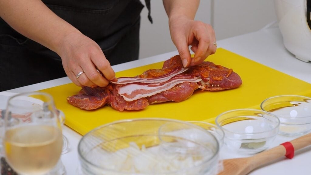4. Za glavno jelo, otkostiti pureći zabatak pa ga dobro premazati solju, paprom i mješavinom biljnog začina. Bilo bi najbolje da ovo napravite večer prije kako bi se okusi što više proželi. Premazati zabatak pestom, složiti preko svega pancetu i oprezno zarolati. Povezati sve kuhinjskim kocem.