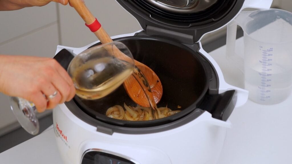 5. Cook4Me staviti u ručni način rada – prženje, zagrijati ulje pa pržiti zabatak sa svih strana dok ne porumeni. Izvaditi ga na stranu. U lonac dodati luk narezan na šnite i pržiti na masnoći od pečenja dok ne zamiriši. Dodati i češnjak, podliti vinom i pustiti par minuta da vino ispari. Začiniti, dodati lovorov list i temeljac te vratiti meso u lonac. Kuhati pod pritiskom 40 minuta.