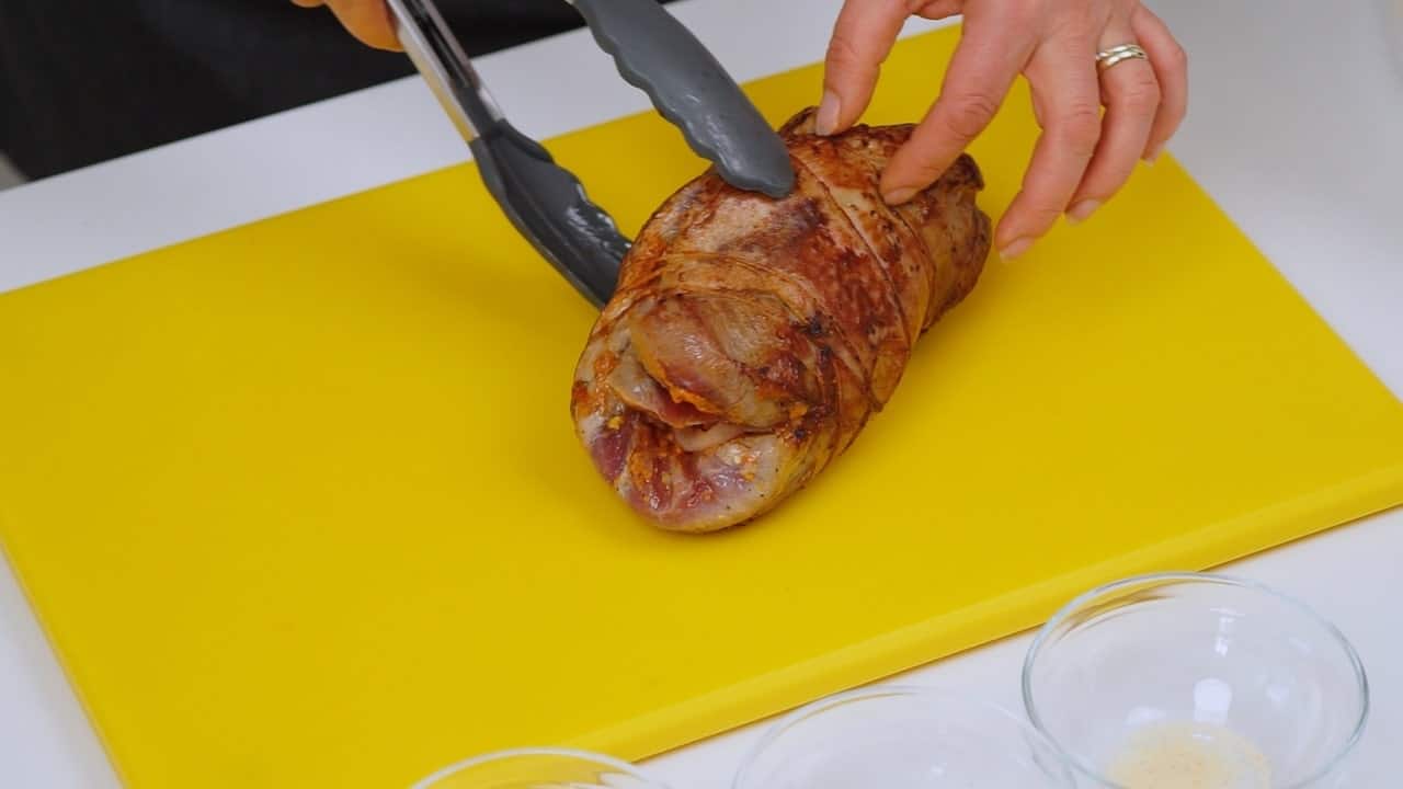 4. Za glavno jelo, otkostiti pureći zabatak pa ga dobro premazati solju, paprom i mješavinom biljnog začina. Bilo bi najbolje da ovo napravite večer prije kako bi se okusi što više proželi. Premazati zabatak pestom, složiti preko svega pancetu i oprezno zarolati. Povezati sve kuhinjskim kocem.