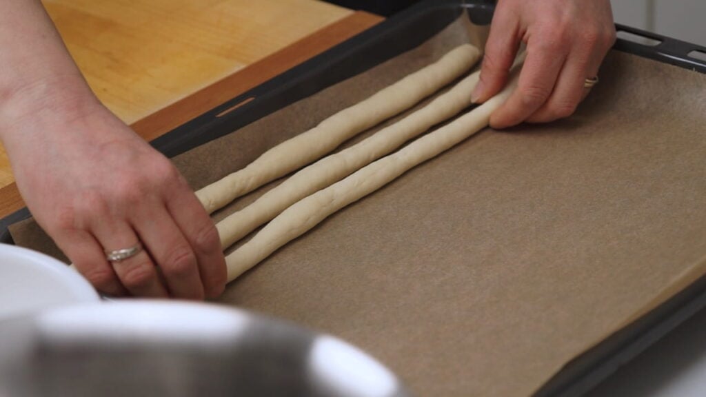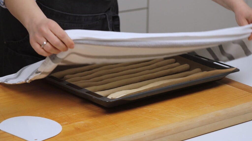- Formirane valjke tijesta slagati u veliki lim za pečenje preko papira za pečenje. Pokriti krpom i ostaviti na toplom 30 min da naraste.