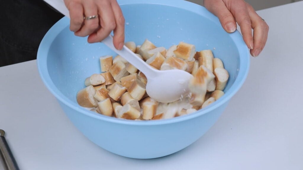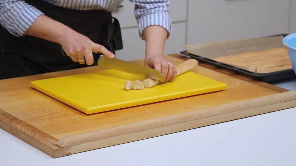 - Prohlađene pečene valjke rezati na komade cca 1,5 cm debljine i prebaciti ih u veću posudu.