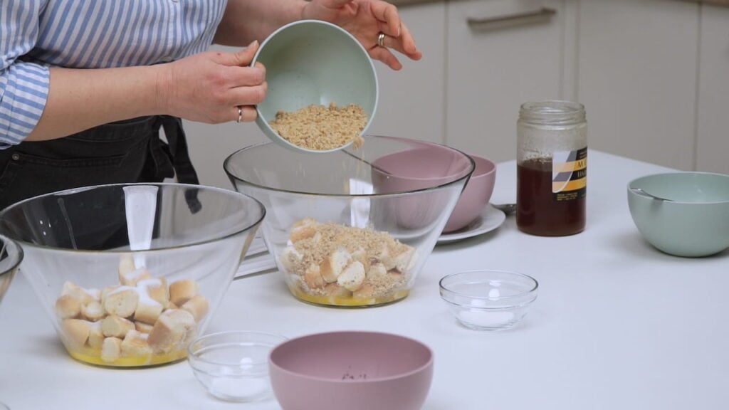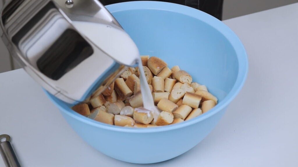 - Zaliti sve kipućim mlijekom, promiješati i ostaviti 1-2 minute da malo upiju mlijeko, ali ne previše. Potom ih šupljom žlicom ocijediti i prebaciti u drugu posudu.