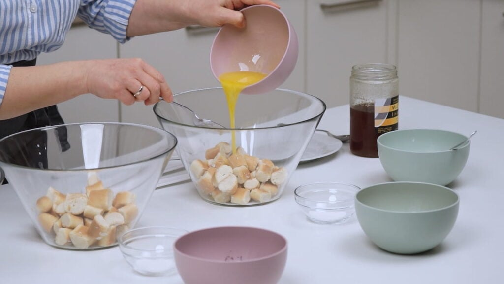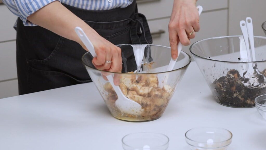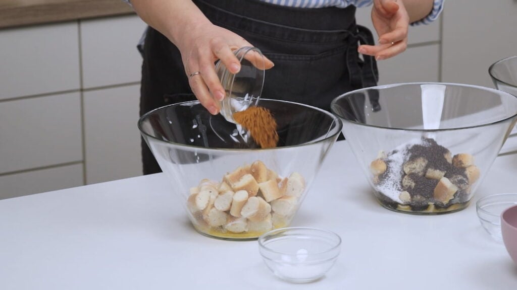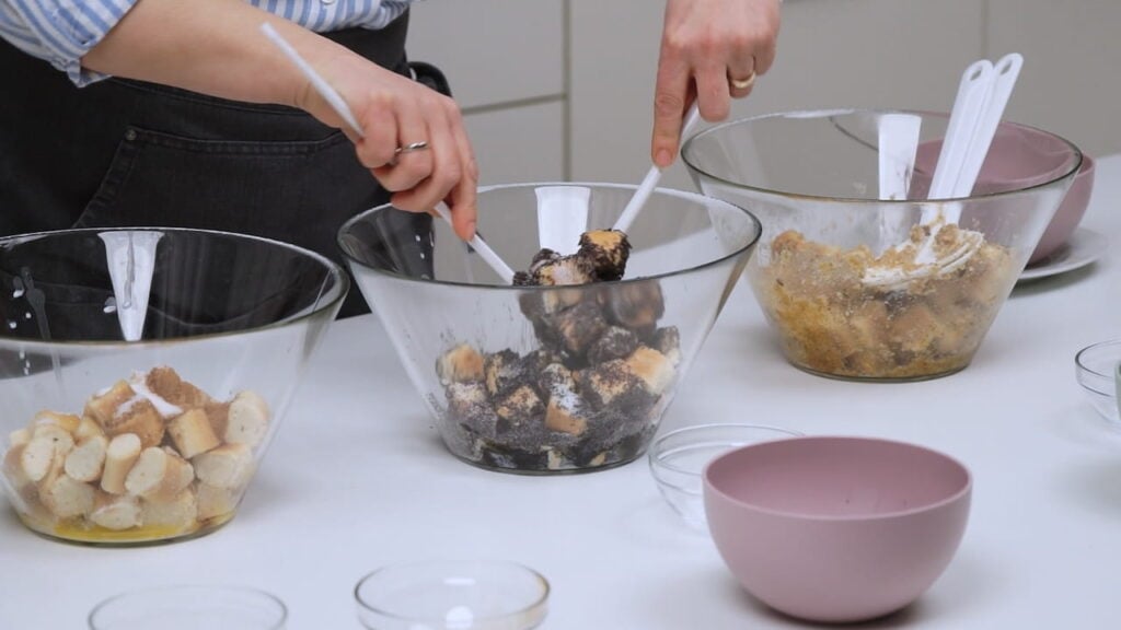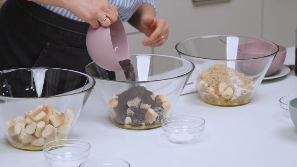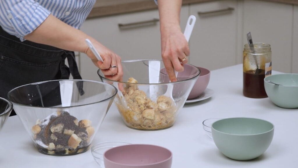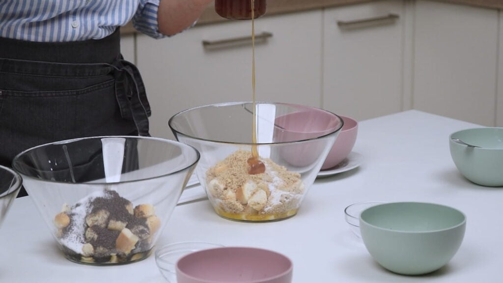 - Za tri različita okusa bobaljki podijeliti ih u tri posude. U svaku posudu dodati trećinu maslaca, a zatim dodati ostalo po želji – mak, vanilin šećer, med, ili orahe ili cimet.