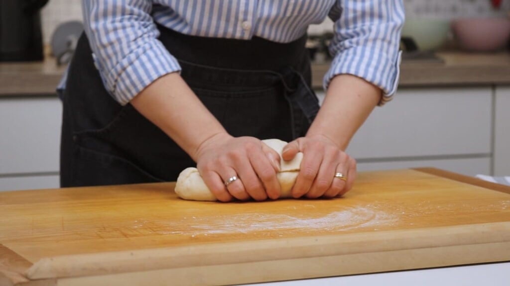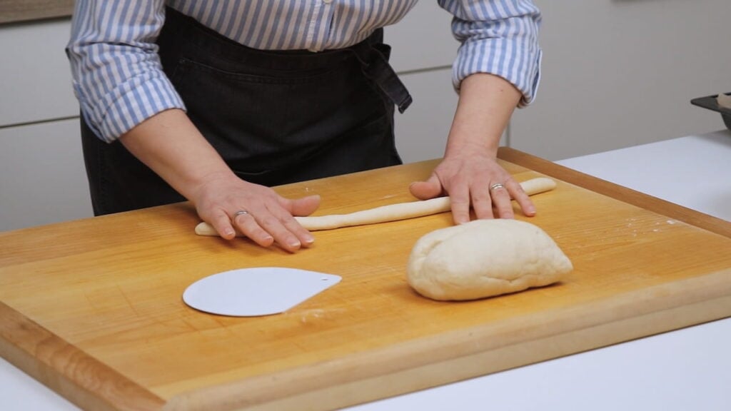 - Prebaciti ga na radnu površinu pa odmah podijeliti na 10-12 dijelova. Od svakog dijela tijesta raditi tanke valjke cca 1 cm debljine.