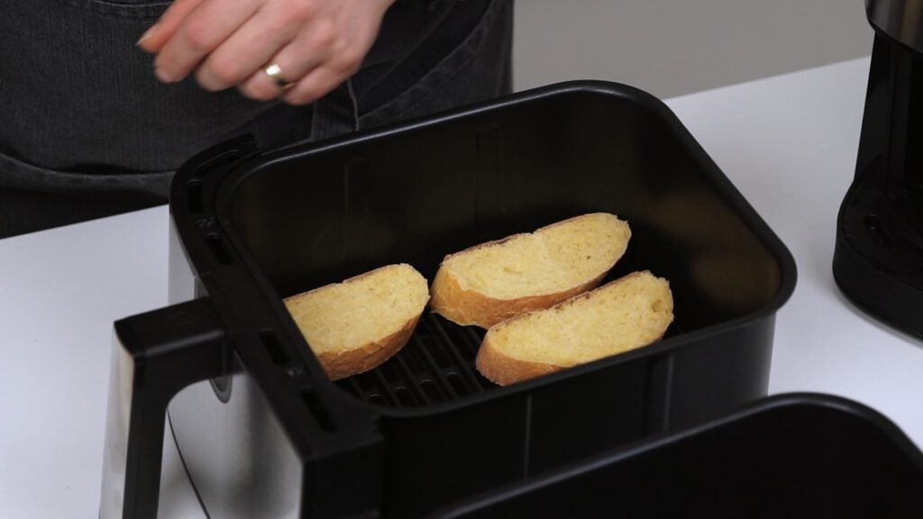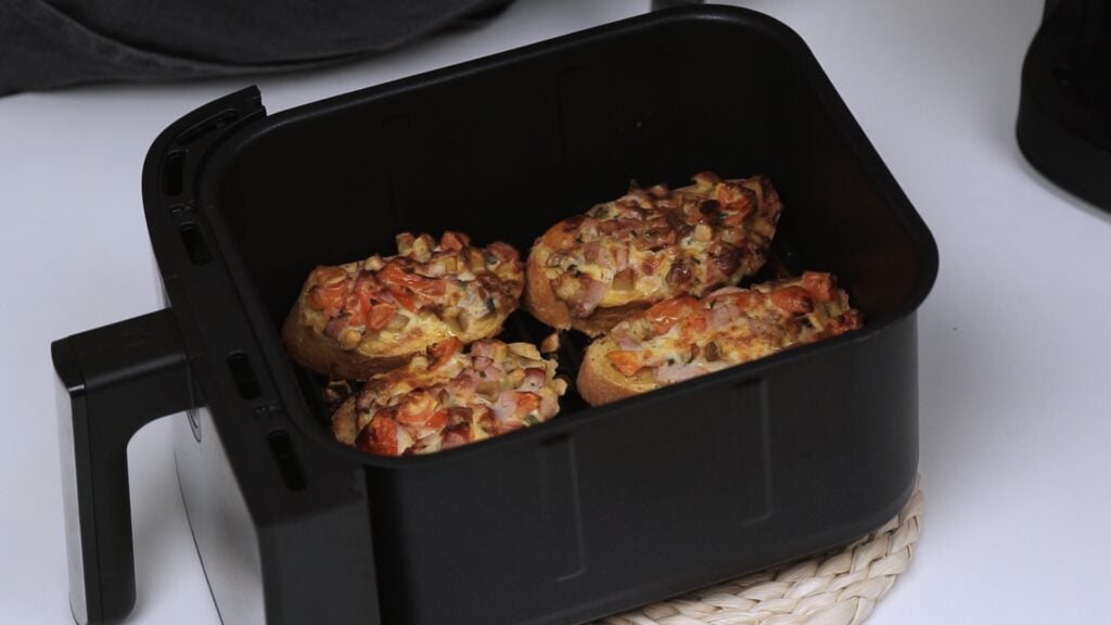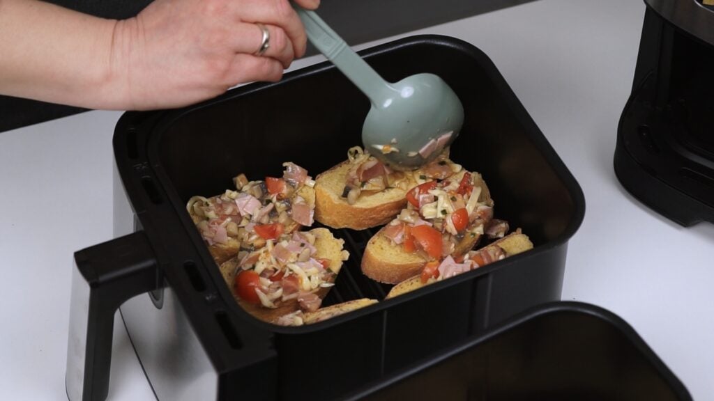 - Šnite kruha poslagati u košare Tefal Dual Easy Fry friteze na vrući zrak. Preko svake šnite kruhe staviti nadjev. Peći u ručnom načina rada na 200*C 8 minuta.