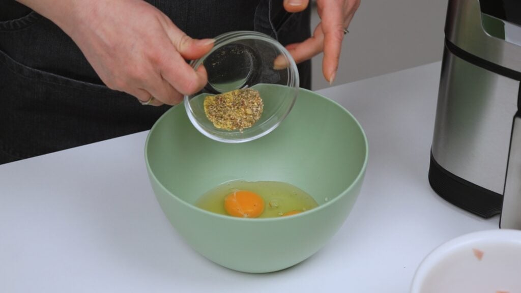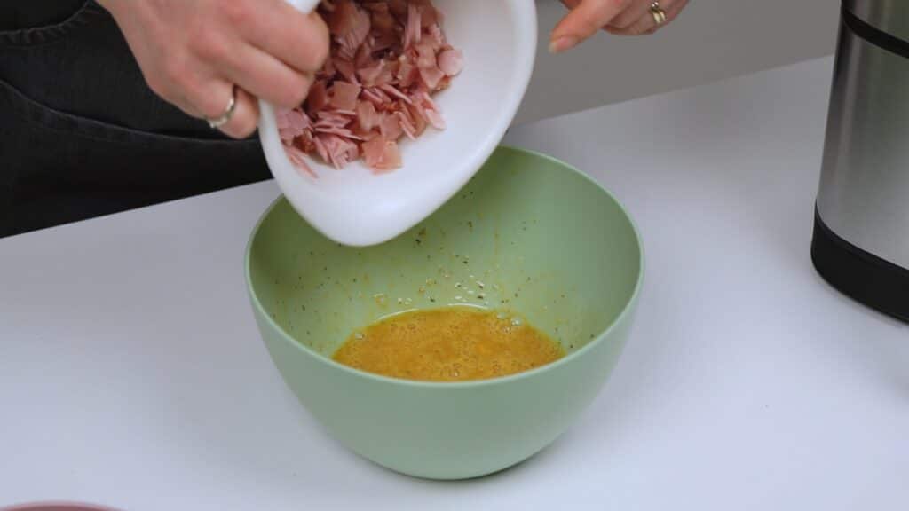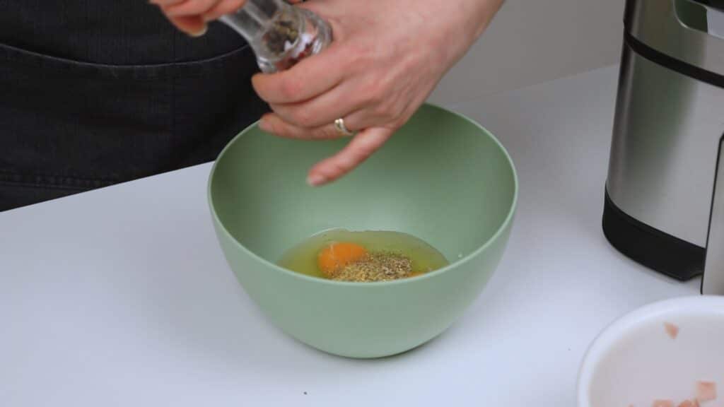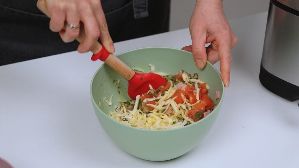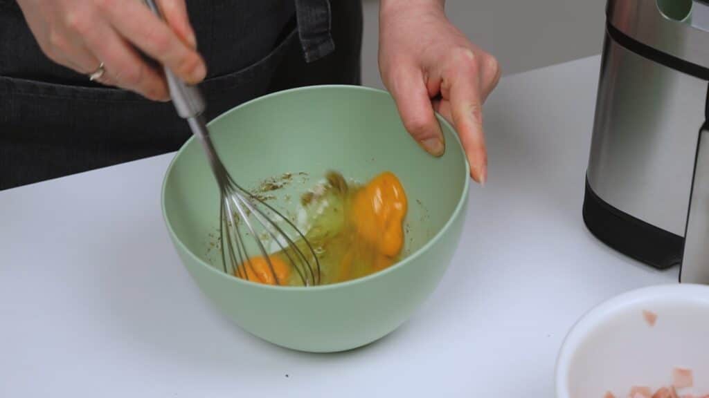 - Pjenjačom umutiti jaja. Začiniti ih solju i paprom. Dodati jajima sve preostale sastojke i dobro sve izmiješati.