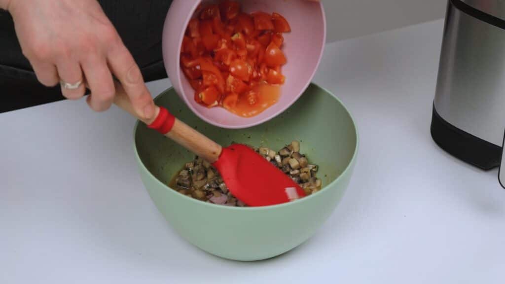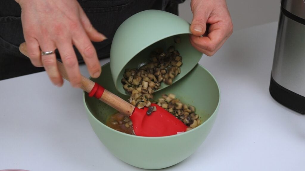 - Šampinjone sitno nasjeckati pa ih popržiti na malo maslinovog ulja. Dodati sjeckani vlasac, češnjak u prahu, posoliti i popapriti.