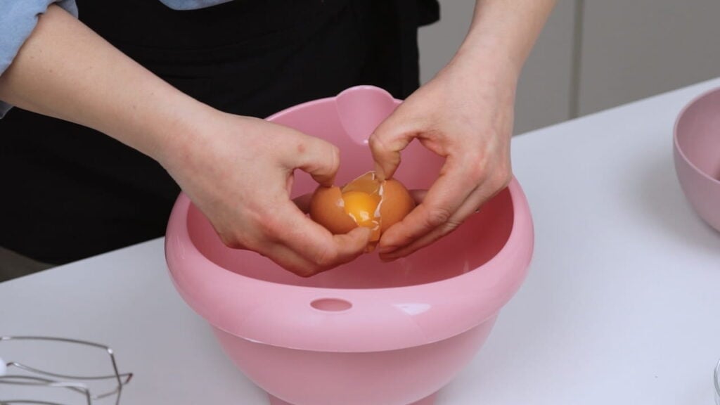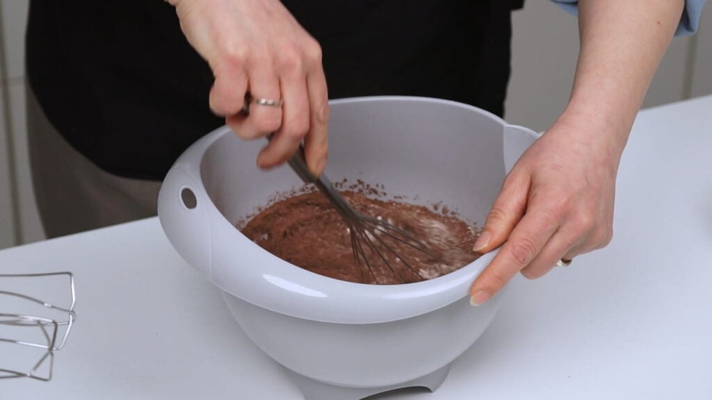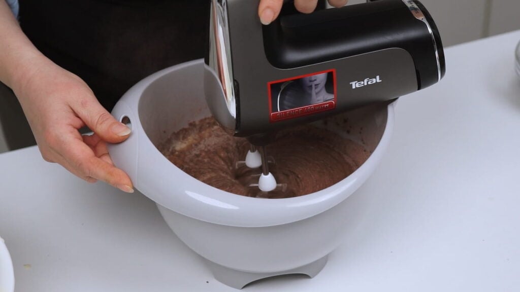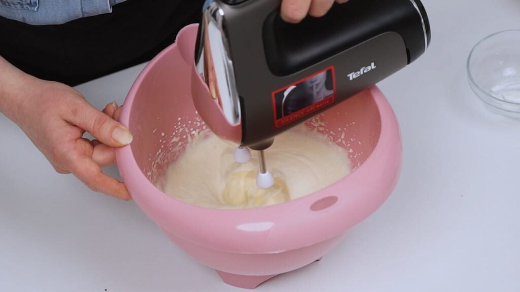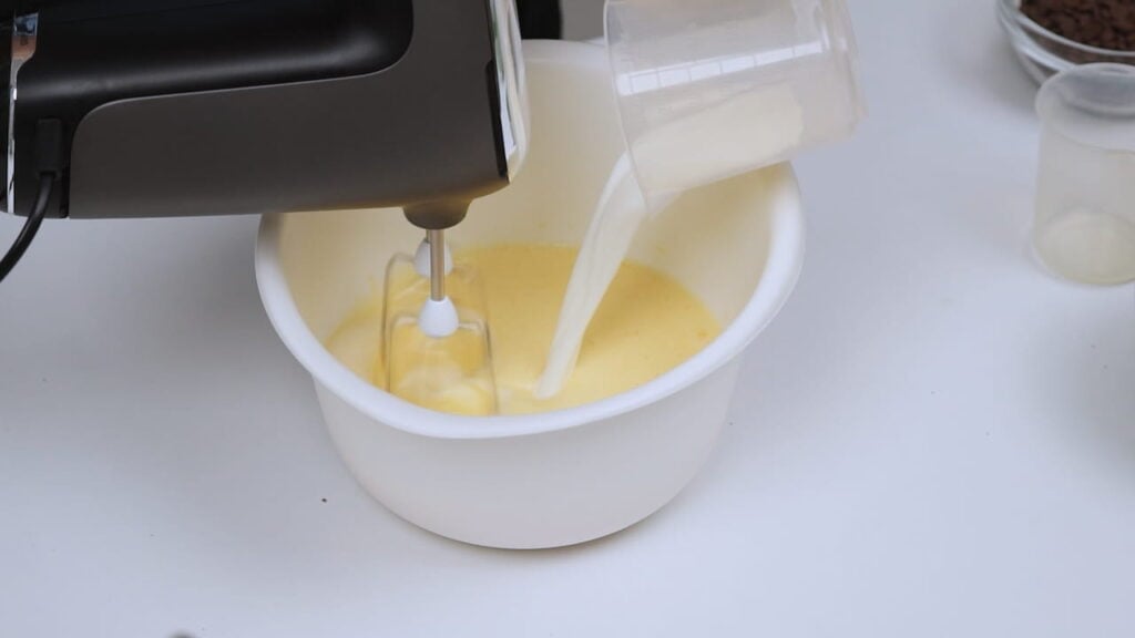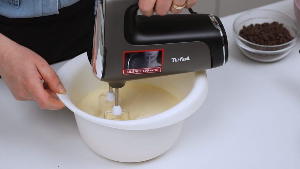 - Pomiješati mokre sastojke: miksati jaja sa ostatkom šećera par minuta, a potom umiksati sve ostale tekuće sastojke.