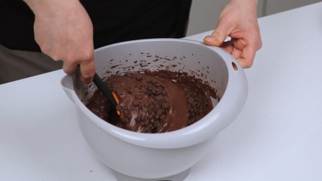 - Na kraju uliti mokre sastojke k suhima i ručno umiješati skoro sve čoko kapljice. Manji dio ostaviti po strani (za posip muffina po vrhu prije pečenja)