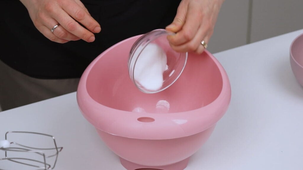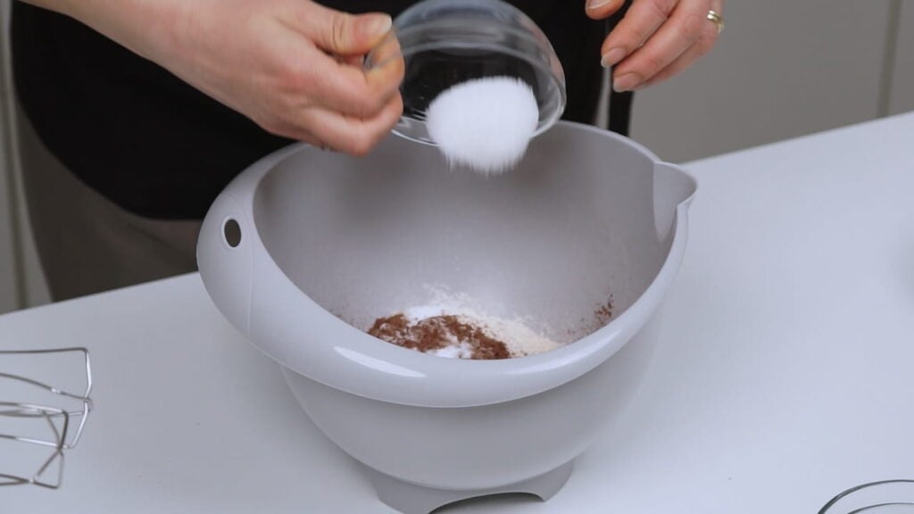 - Pomiješati najprije sve suhe sastojke. Jedan mali dio šećera ostaviti po strani.