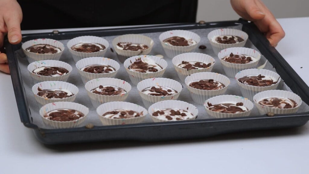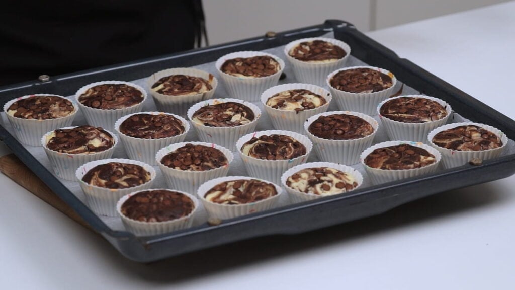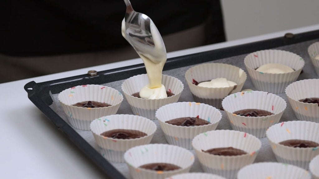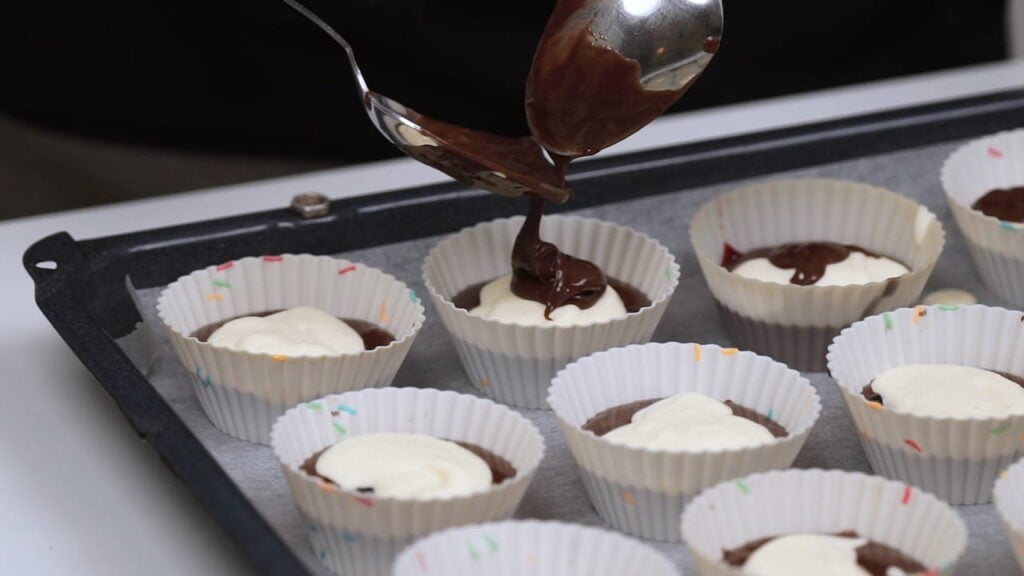 - U košarice za muffine staviti veliku žlicu čoko smjese, pa žličicu džema, pa potom veliku žlicu cheesecake kreme, pa na vrh pola žlice čoko smjese. Drvenim štapićem napraviti spiralne uzorke po svakom muffinu. Na samom kraju po vrhu svakog muffina posipati preostalu čokoladu.