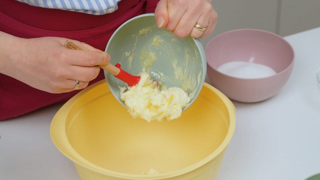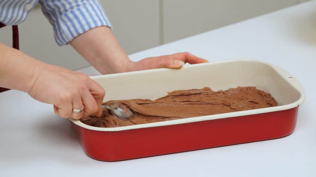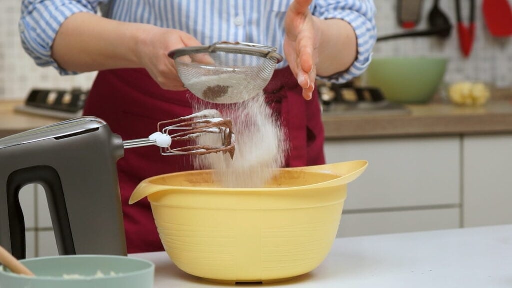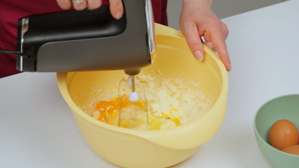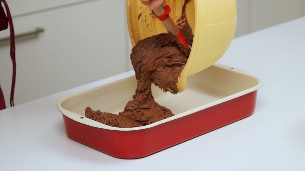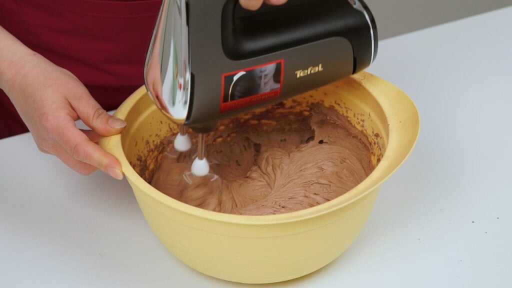 - Za biskvit miksati maslac sobne temperature (ako je pretvrd, stavite ga u mikrovalnu na 30 sekundi) sa šećerom par minuta. Umiješati u tu smjesu jedno po jedno jaje. Na kraju umiješati kakao, prašak za pecivo i brašno.