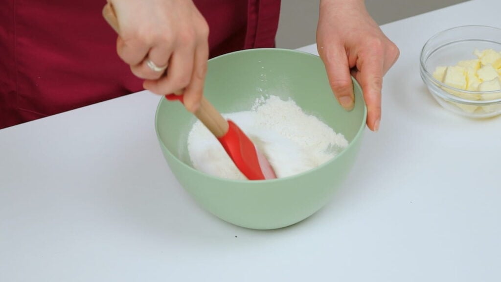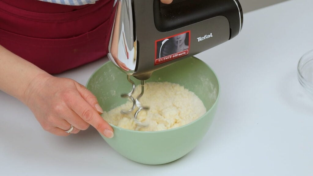 - Za mrvice pomiješati brašno i šećer, dodati maslac izrezan na komadiće pa rukama napraviti mrvice od ove smjese.
