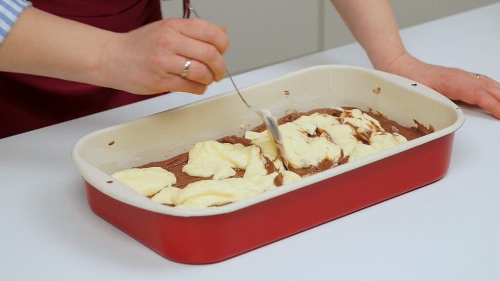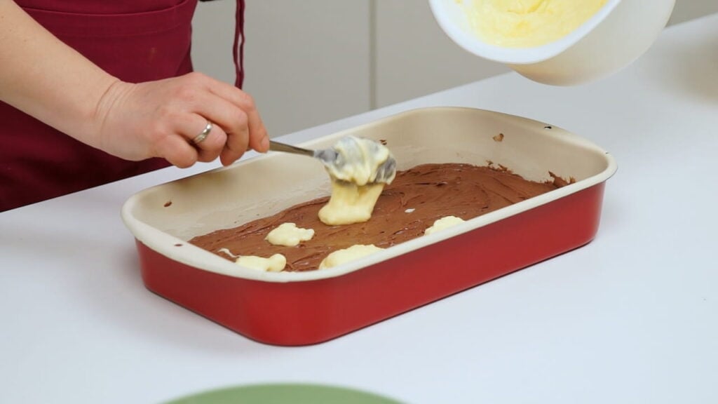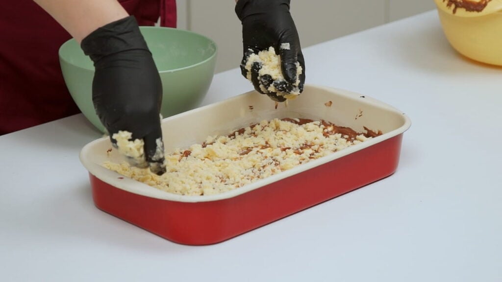 - U namašćen i pobrašnjen lim srednje veličine (moj je 25×35 cm) izručiti biskvitnu smjesu. Dosta je gusta pa je pažljivo žlicom razmažite preko cijele površine lima. Preko biskvitne smjese rasporedite u malim hrpicama kremu od pudinga. Uz pomoć žlice napravite mramorni efekt po površini biskvita tako da žlicom potežete u svim smjerovima po cijelom limu. Preko svega toga rukama posipati pripremljene mrvice.