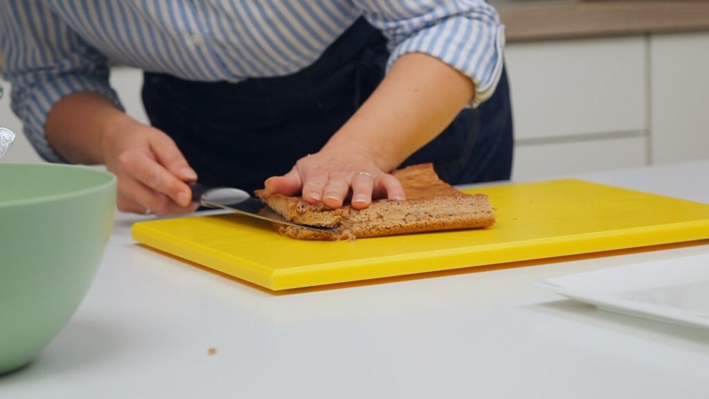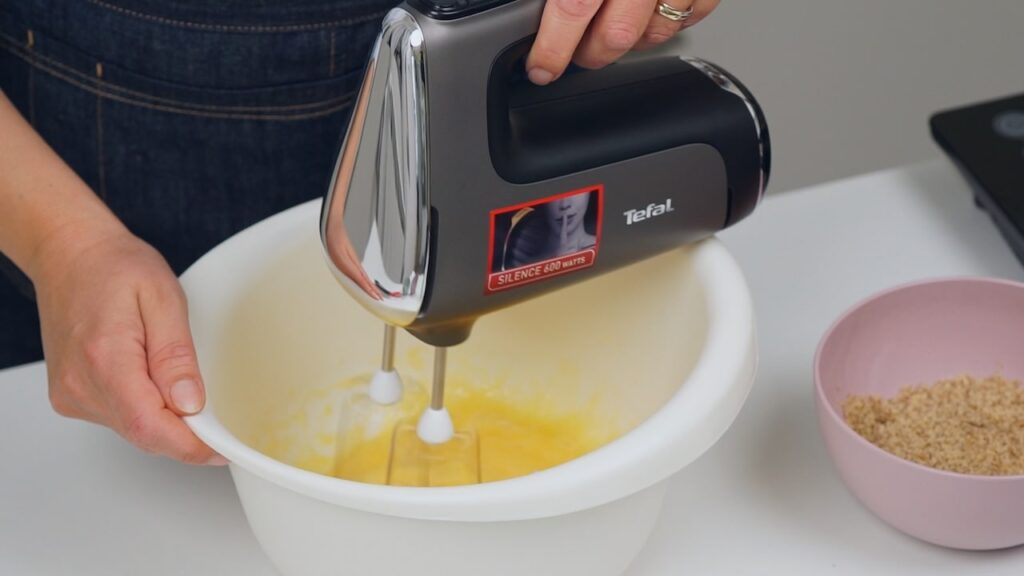 - Za biskvit miksati jaja sa šećerom dok ne postanu pjenasta i svijetlo žuta. Tada ručno lagano umiješati orahe, brašno i prašak za pecivo. Izliti sve u lim za pečenje srednje veličine preko papira za pečenje i peći na 180*C 20-25 minuta. Pečeni biskvit prohladiti pa odstraniti papir za pečenje.