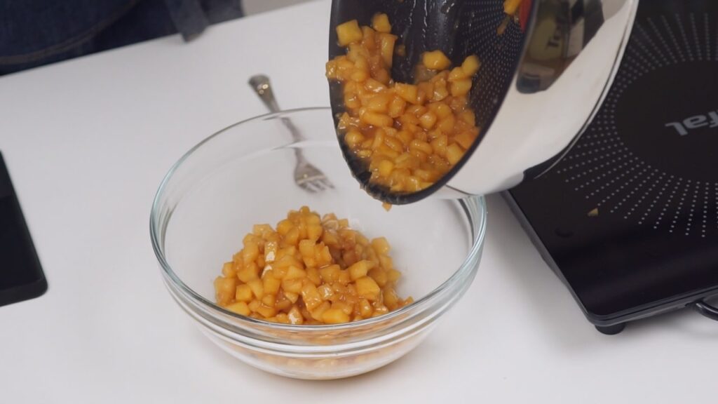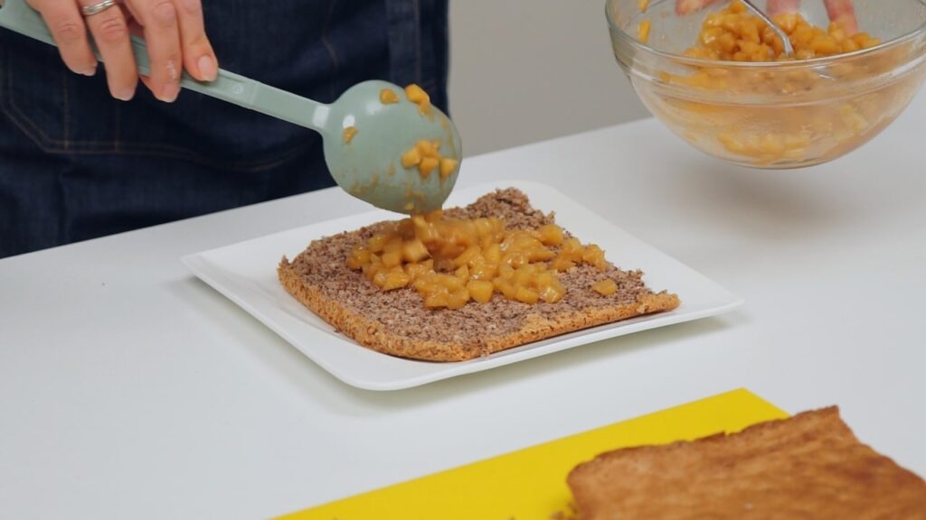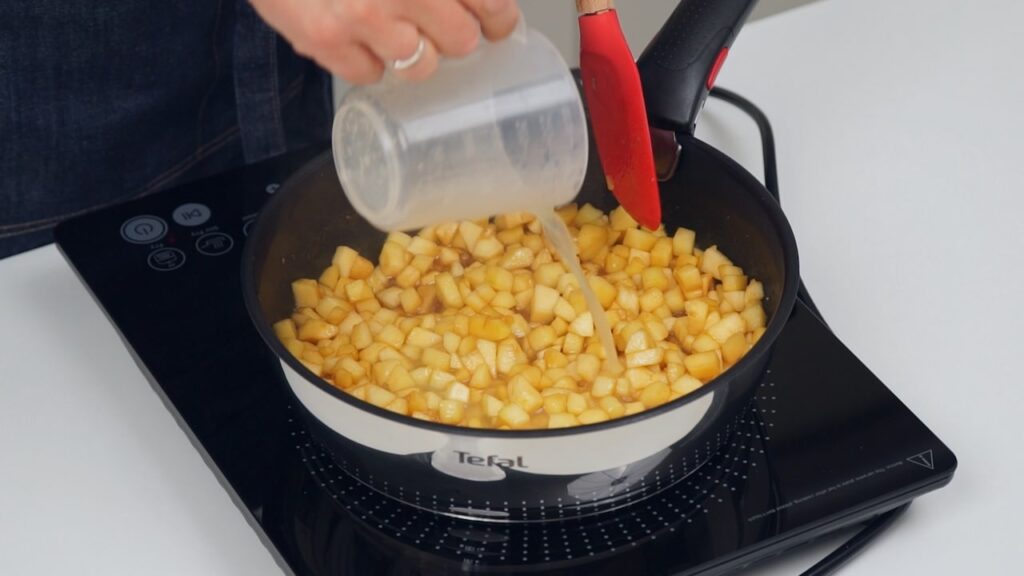 - Za karamelizirane jabuke, jabuke najprije oguliti i nasjeckati na male kockice. Tada u tavici otopiti šećer dok ne postane karamel, dodati maslac, otopiti i njega uz miješanje pa na sve dodati jabuke. Uz miješanje pirjati 5 minuta dok jabuke fino ne omekšaju i dok sva tekućina koju su pustile ne ispari. Prohladiti.