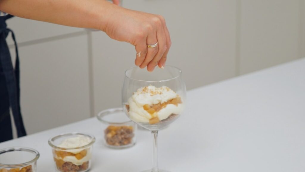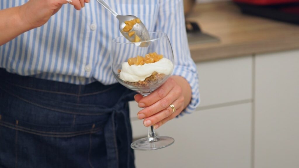 - Ukoliko želite desert u čaši biskvit ručno istrgajte i složite malo na dno čaše, dodajte jabuke pa sirnu kremu, opet malo jabuka i završite kremom. Posipajte krokantom ili mljevenim orasima i rashladite prije posluživanja.