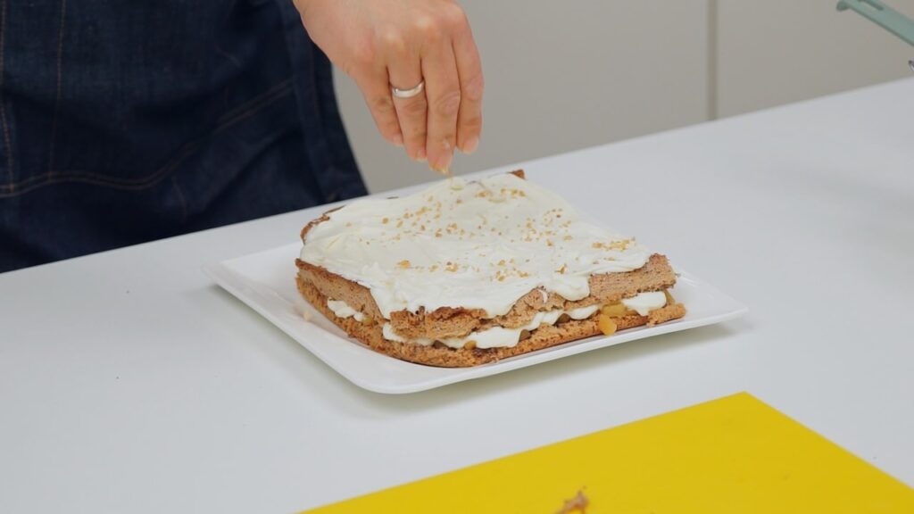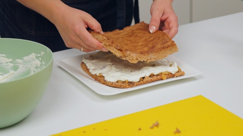 - Ukoliko slažete kolač biskvit prerežite vodoravno na dva dijela da dobijete dvije kore. Na donju koru složiti jabuke, preko jabuka polovicu kreme. Poklopiti drugom korom i premazati ostatkom kreme. Po želji posipati krokantom ili bademima u listićima i rashladiti prije rezanja na kocke.