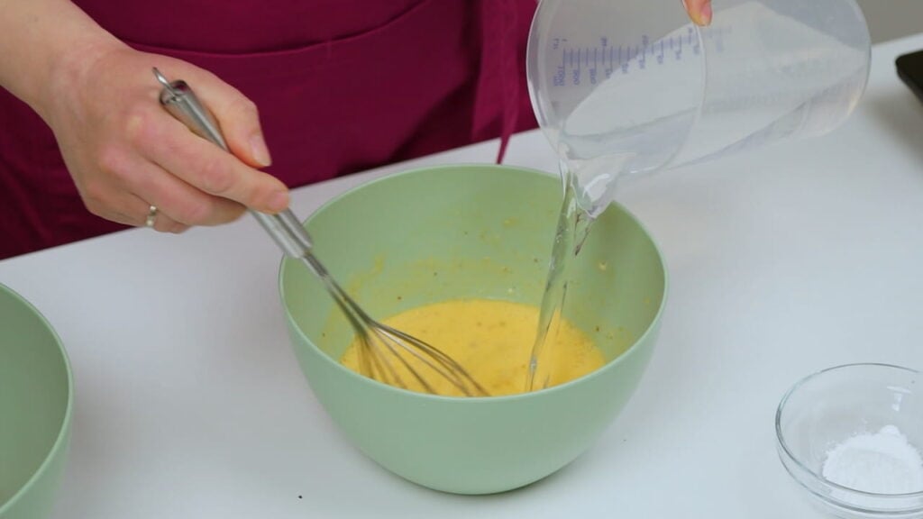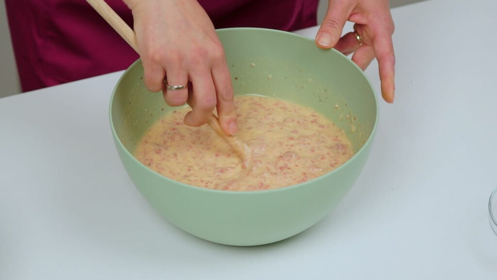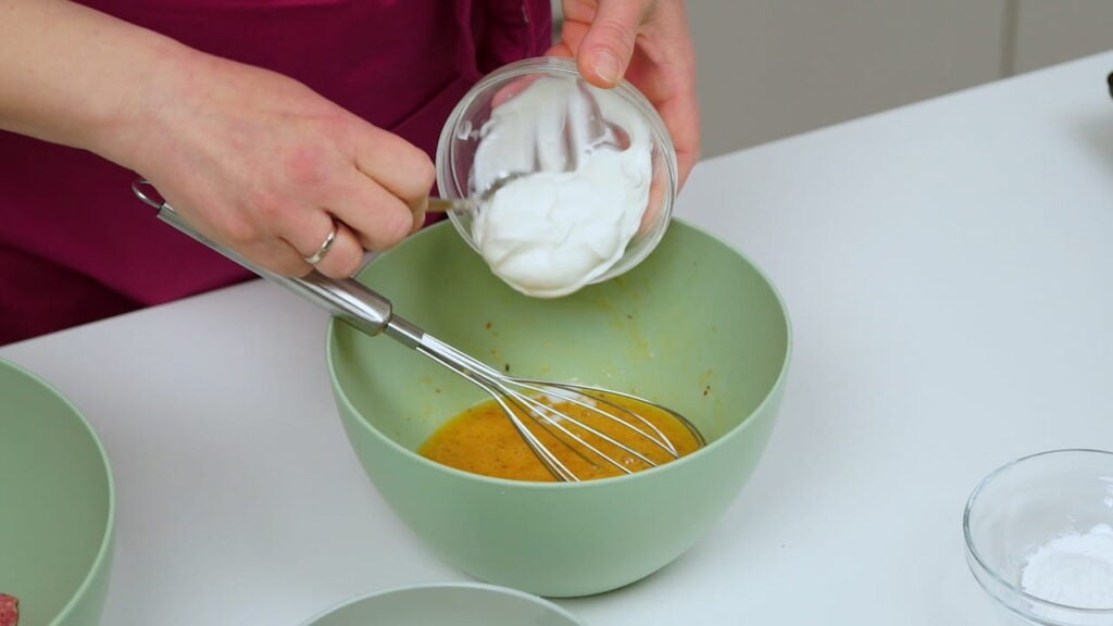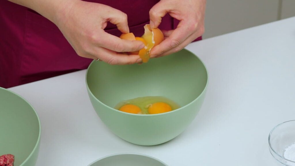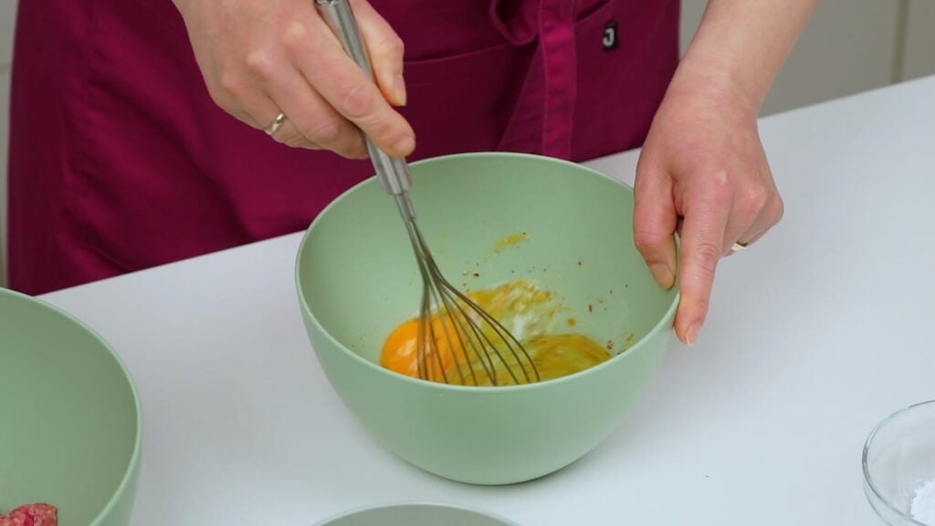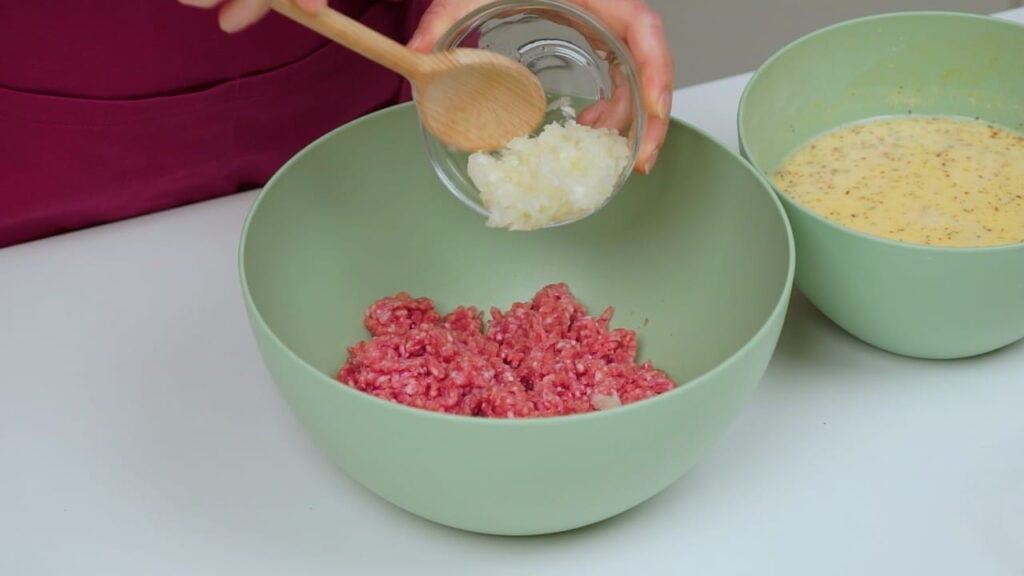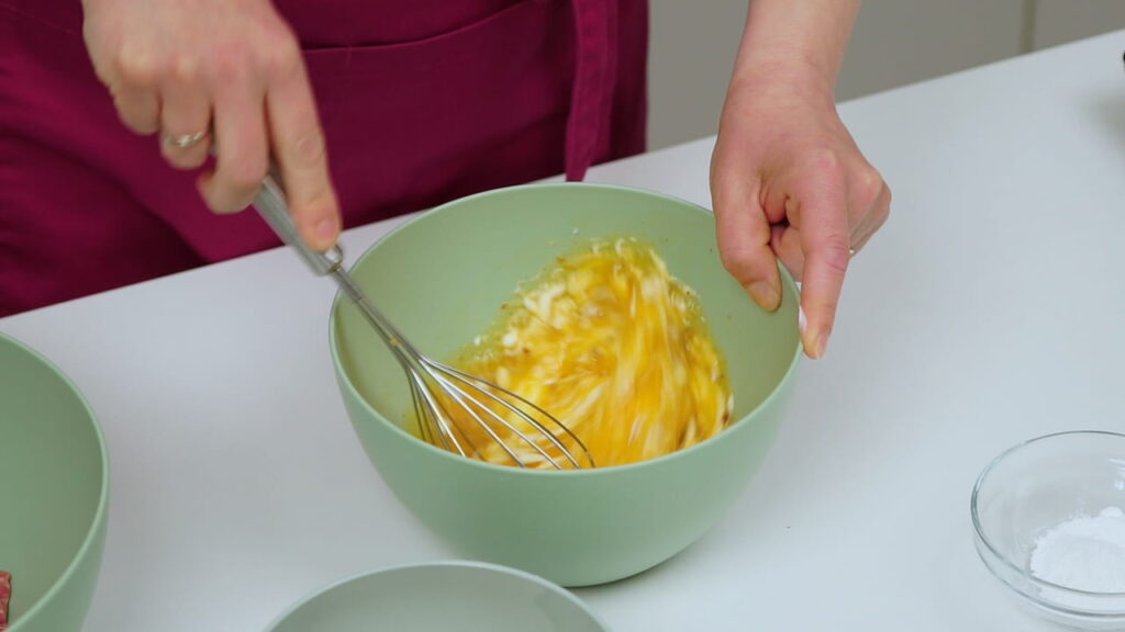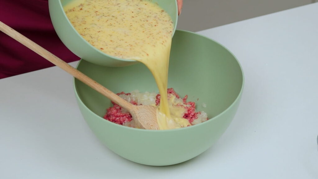 - Pjenjačom umutiti jaja sa začinima, vrhnjem i vodom. Dodati i prašak za pecivo i brašno. Sve to uliti k mesu koje prethodno treba pomiješati sa sitno sjeckanim lukom.