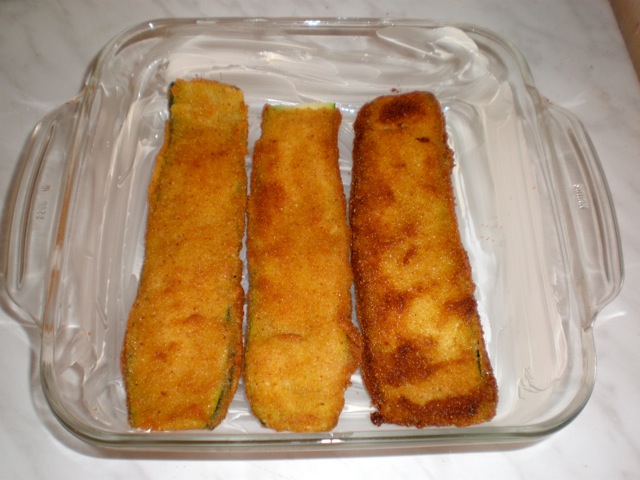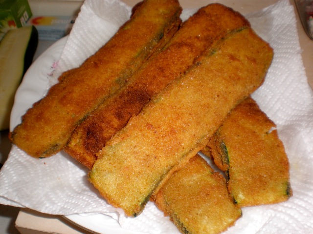 - Za to vrijeme tikvice oprati pa ih uzdužno narezati na tanke ploške, panirati ih u brašnu, jajima i mrvicama i ispržiti u dubokom ulju dok ne porumene.