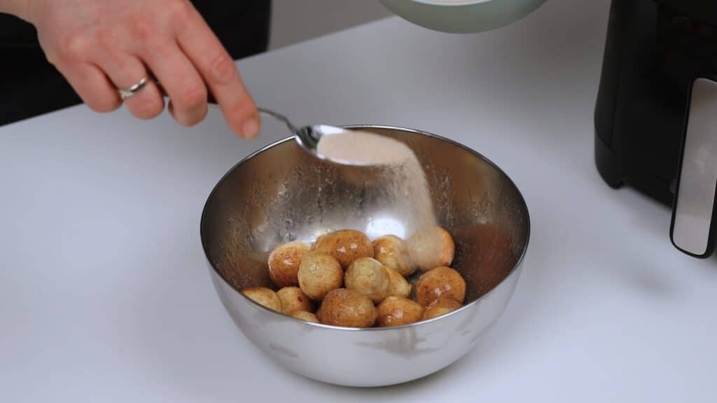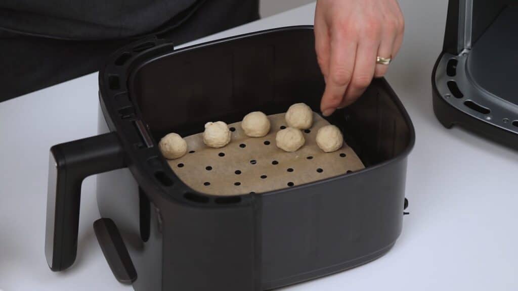 2. Okruglice slagati u košaru Easy Fry friteze u malim razmacima. Košaru je dobro obložiti papirom za pečenje. Peći na funkciji airfry 10 min na 180*C. Nakon 5 minuta okruglice protresti i ispeći do kraja.
