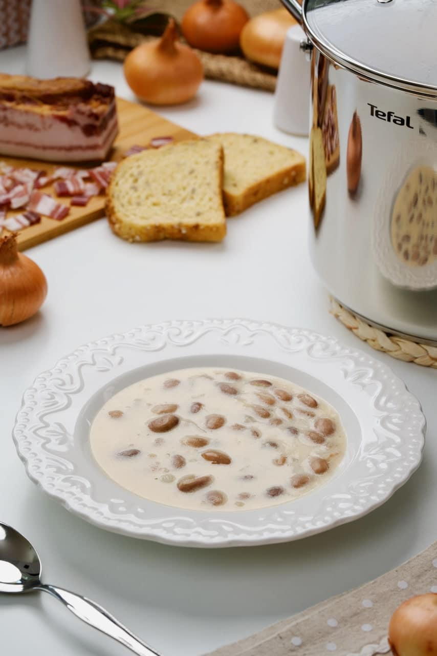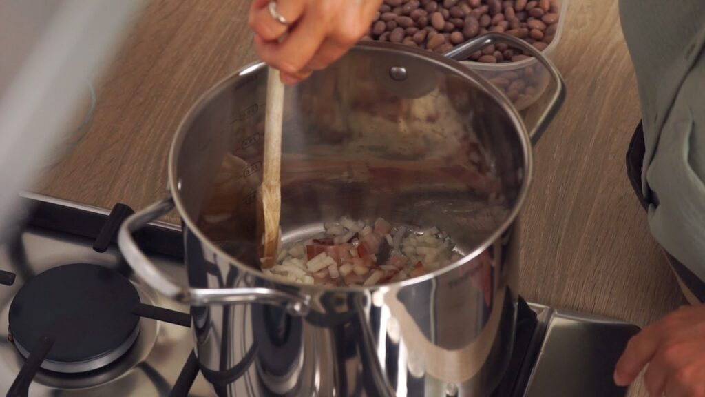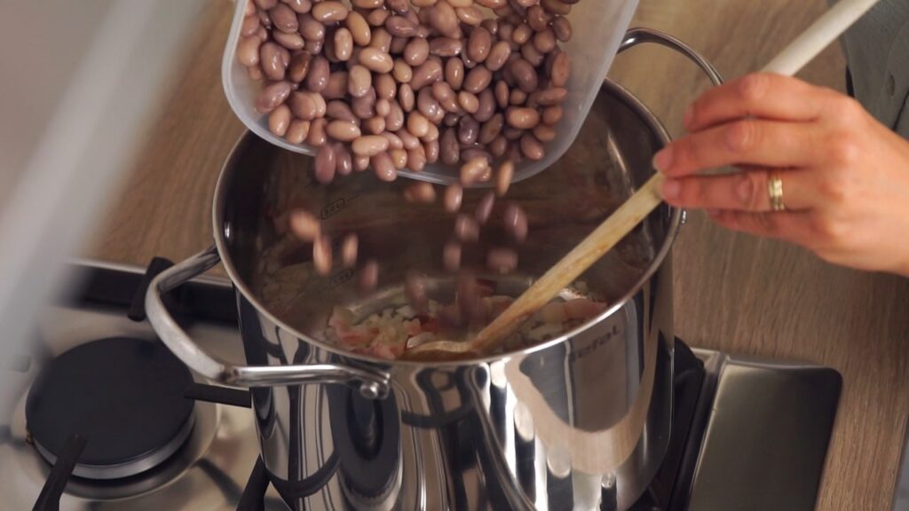 - Pržiti na malo ulja sitno sjeckan luk. Dodati sjeckanu slaninu pa popržiti da zarumeni. Tada dodato u lonac prokuhan i ocijeđen grah. Začiniti odmah po želji pa kratko pržiti uz miješanje par minuta. Doliti tada vodu i mlijeko tako da grah bude potpuno prekriven. Kuhati na umjerenoj vatri 20-tak minuta. Ako je potrebno dodati još malo vode.