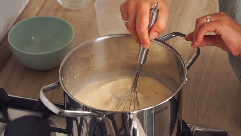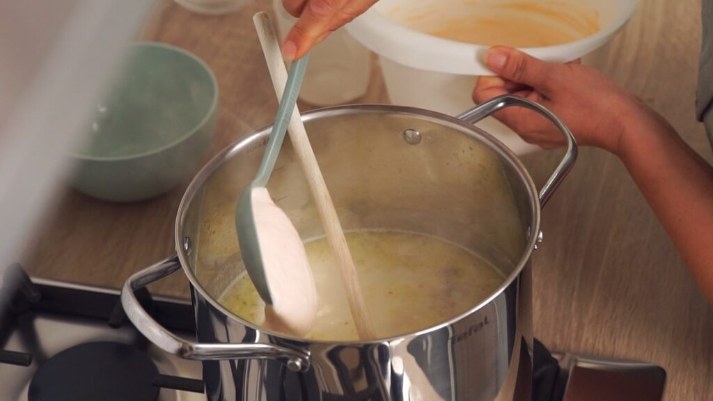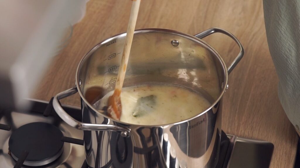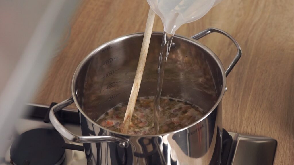 - Ovako dobivenu zapršku polaku uliti u lonac ka grahu i pustiti da kratko prokuha uz neprestano miješanje.